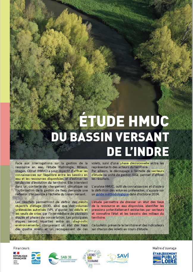 L’étude HMUC est née du choix du territoire d’engager une réflexion dans l’objectif d’améliorer la gestion de l’eau pour le bassin versant de l’Indre. Considéré fondamental, l’enjeu quantitatif de la ressource constitue une priorité pour le Syndicat d’Aménagement du Bassin de l’Indre (SABI 36), la Communauté de Communes Loches Sud Touraine (CCLST) et le Syndicat d’Aménagement de la Vallée de l’Indre (SAVI 37), 3 collectivités en charge de la gestion de l’eau et des milieux aquatiques sur le bassin de l’Indre, qui cofinancent l’étude HMUC avec l’Agence de l’eau Loire-Bretagne.