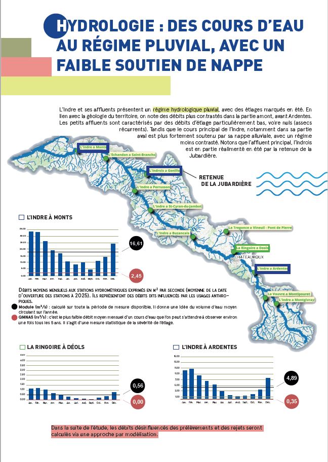 Sur cette base de travail, les trois collectivités ont souhaité s’orienter vers une analyse quantitative de la ressource en eau, et ont sollicité en 2023 l’Établissement public Loire (Analyse HMUC du bassin versant de l’Indre – Etablissement public Loire) pour être maître d’ouvrage d’une étude HMUC. L’orientation de la démarche s’est axée vers une étude de l’hydrologie et des eaux superficielles.